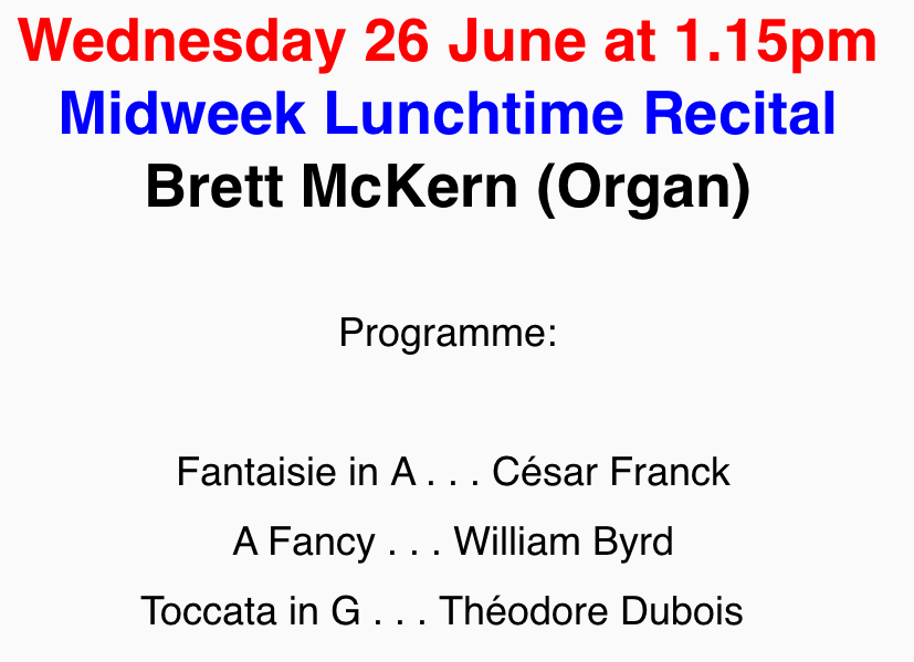 Brett’s next recital is Wednesday 28 August at 1.15pm at St Jude’s Bowral. This is the third concert in the series celebrating the completion of the rebuild of the St Jude’s organ. Music will include Mendelsohn’s Sonata No. 6, Vaughan Williams’ Rosymedre, and the premiere of my new ‘A Little Passacaglia & Fugue in memoriam Robert Smith’, commissioned by his widow. It is a great honour to have been asked to compose and now play this work. We hope you can join us on this occasion to honour Sydney Organist Robert Smith’s memory.